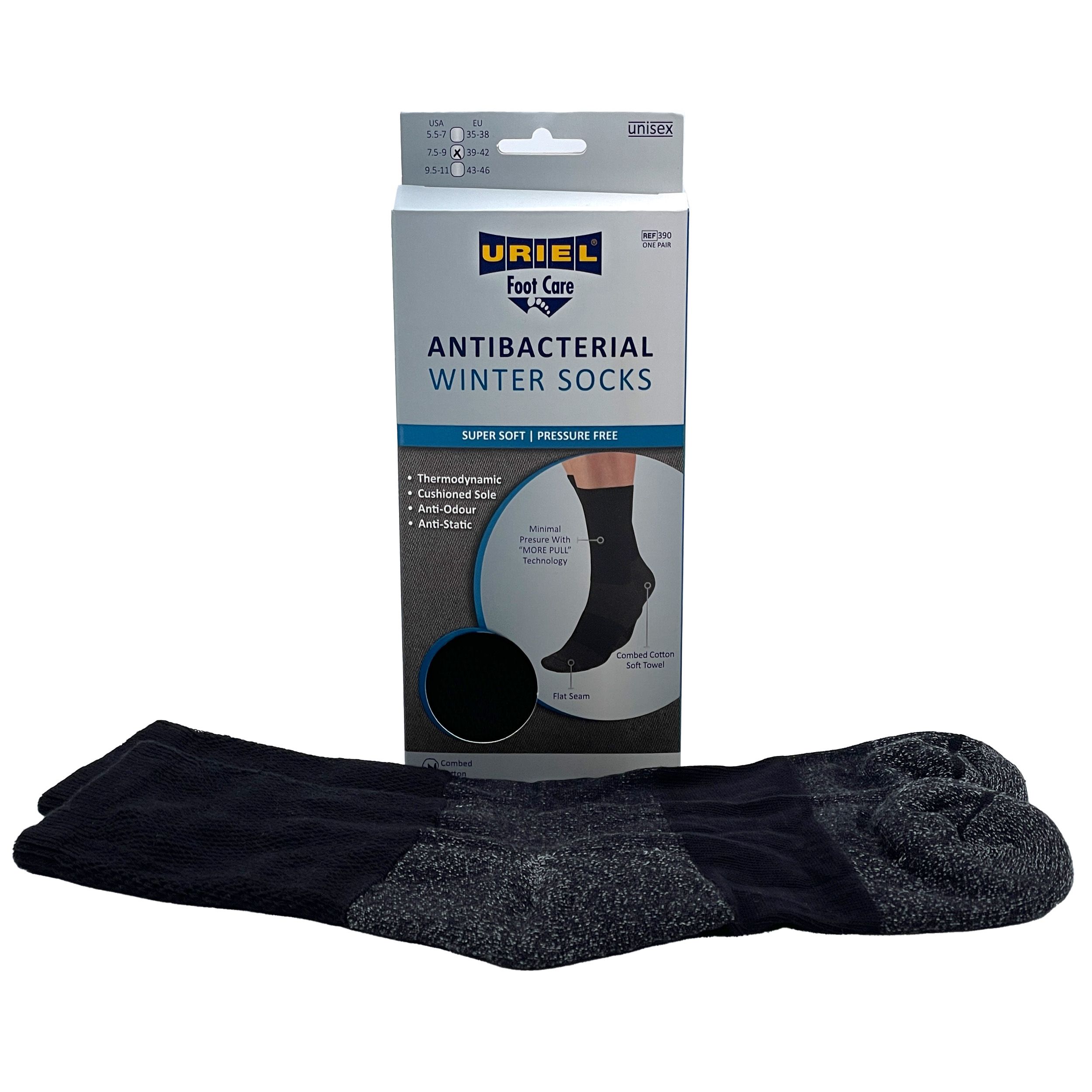 Urielin antibakteerinen sukka on valmistettu erityisellä ""More Pull"" -kudontatekniikalla. Tekniikan käyttö vähentää sukan puristavuutta. Saumaton ja pehmeä sukka soveltuu erityisen hyvin diabeetikon käyttöön. Neulokseen on lisätty hopeakuitua, jolla on antiseptinen ja deodoroiva vaikutus. Hopea kompensoi ilman lämpötilan vaihteluja - jalat pysyvät siis aina sopivan lämpöisinä!
