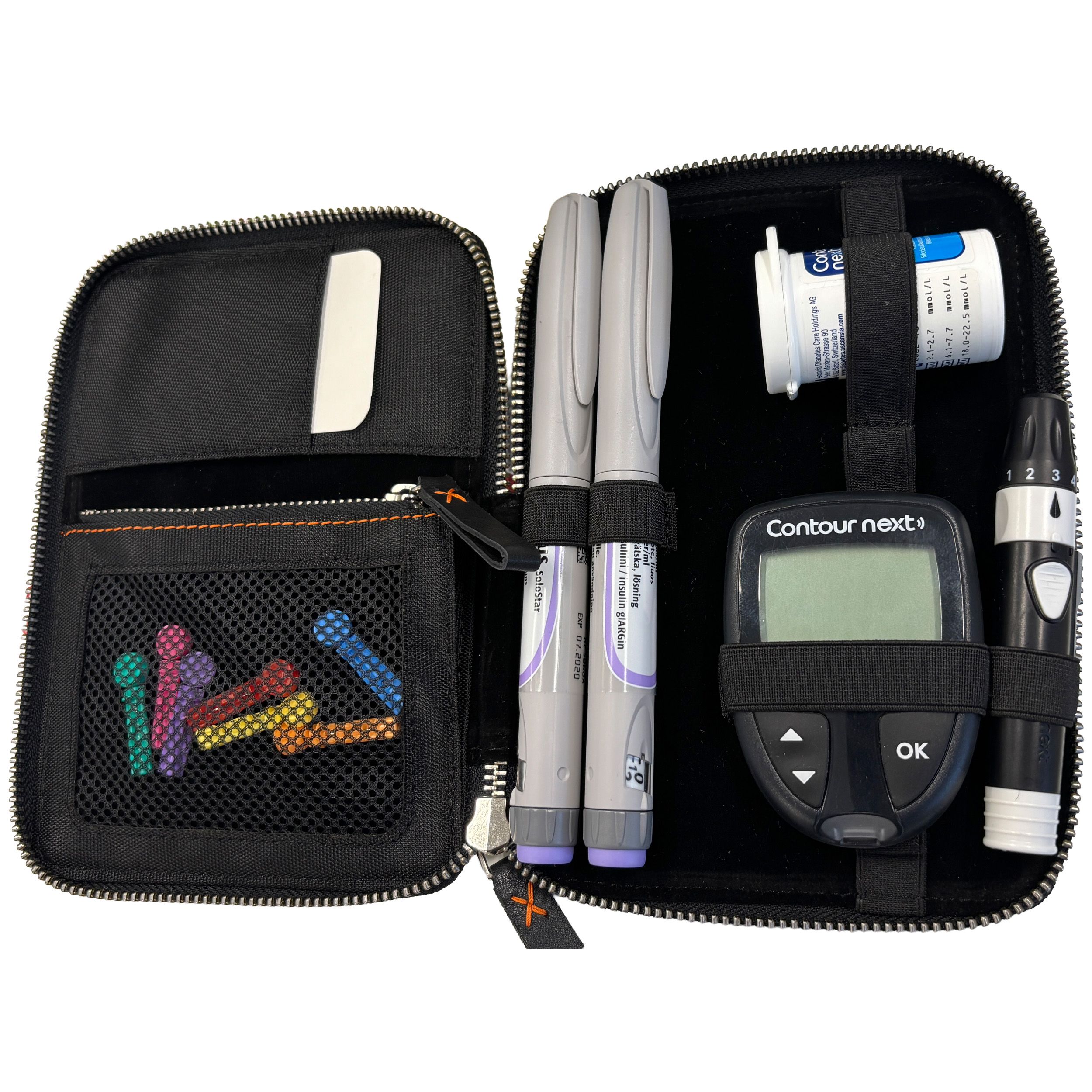 Diabag ONE -tarvikelaukussa yhdistyy tyylikkyys ja käytännöllisyys. Laukussa on riittävästi tilaa esimerkiksi verensokerimittarille, pistolaitteelle, testiliuskapurkille, lanseteille, insuliinikynälle ja -neuloille, kortille tai päiväkirjalle. Saat kaiken tärkeän kulkemaan mukanasi hallitun huolitellusti.
