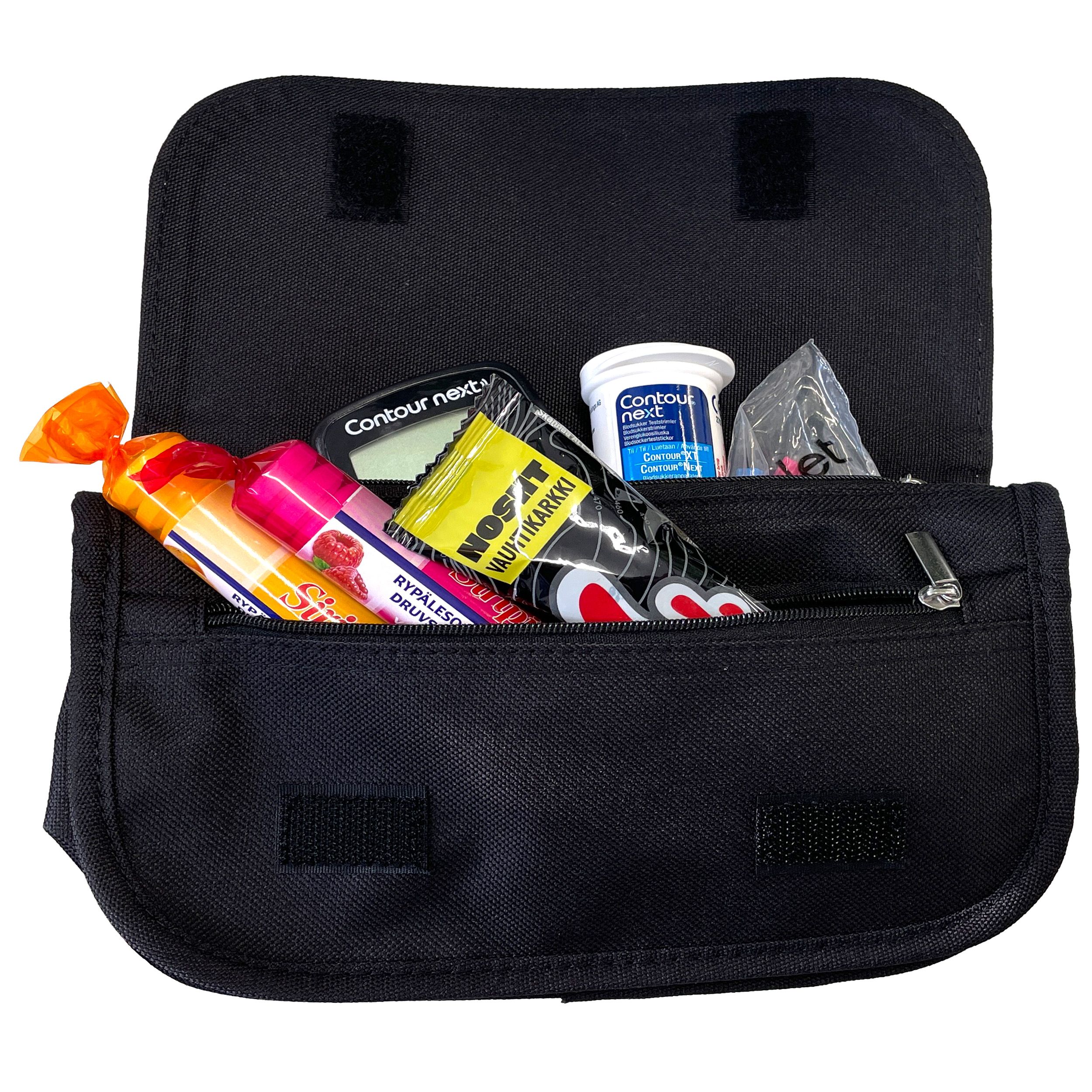 Diabeetikon tarvikelaukun läpässä on tarrakiinnitys ja läppä on kokonaan irrotettavissa. Läpän alta mahtuu kulkemaan esim. vyö, jolloin laukku kulkee näppärästi mukana. Laukun kahdessa vetoketjullisessa taskussa on lokerot erikokoisille tarvikkeille.