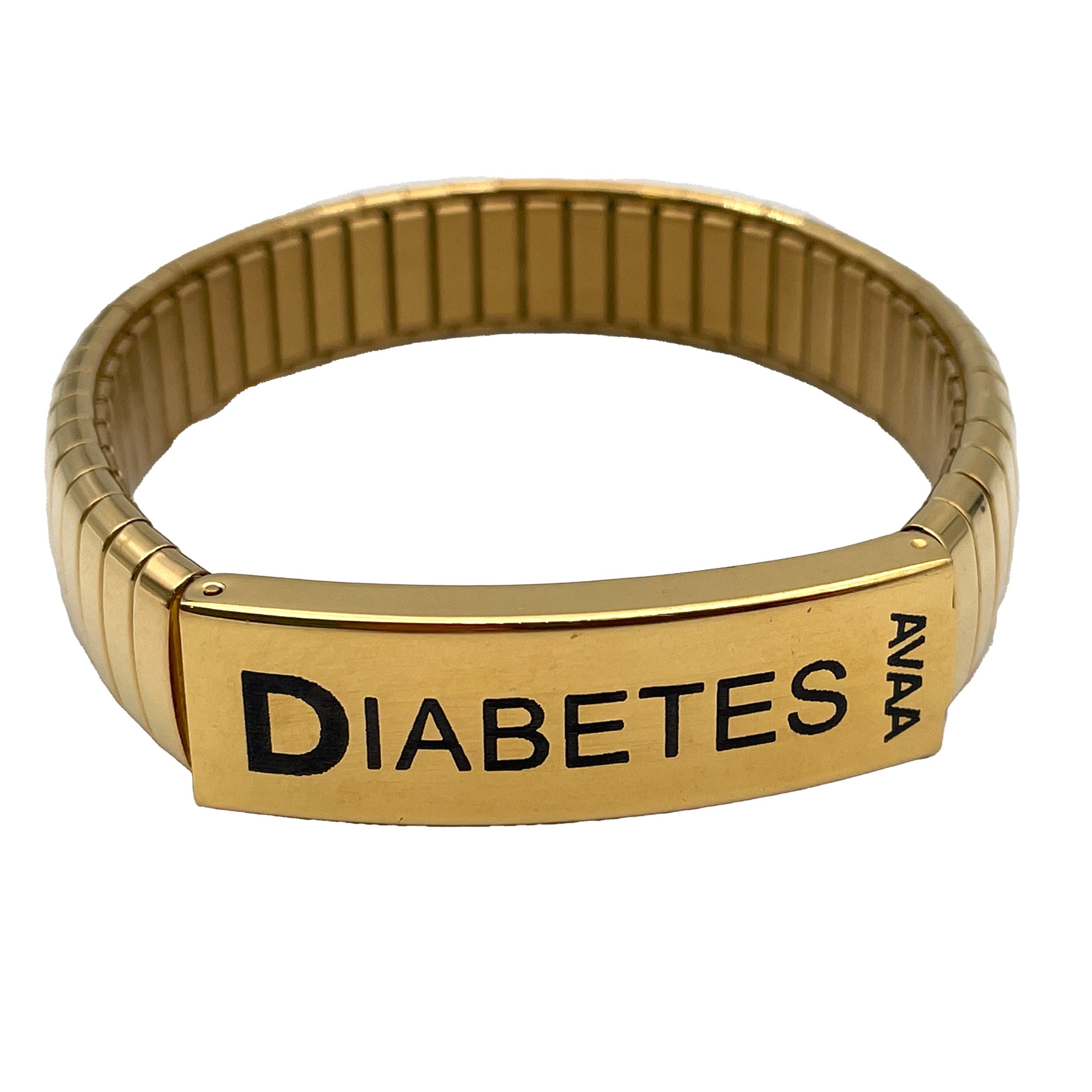 - Tuotepolku Etusivu DIABETESTUOTTEETDiabetestunnuksetRannekkeet Diabetestunnus, leveä venyvä teräsranneke, kullattu (19,5 cm)