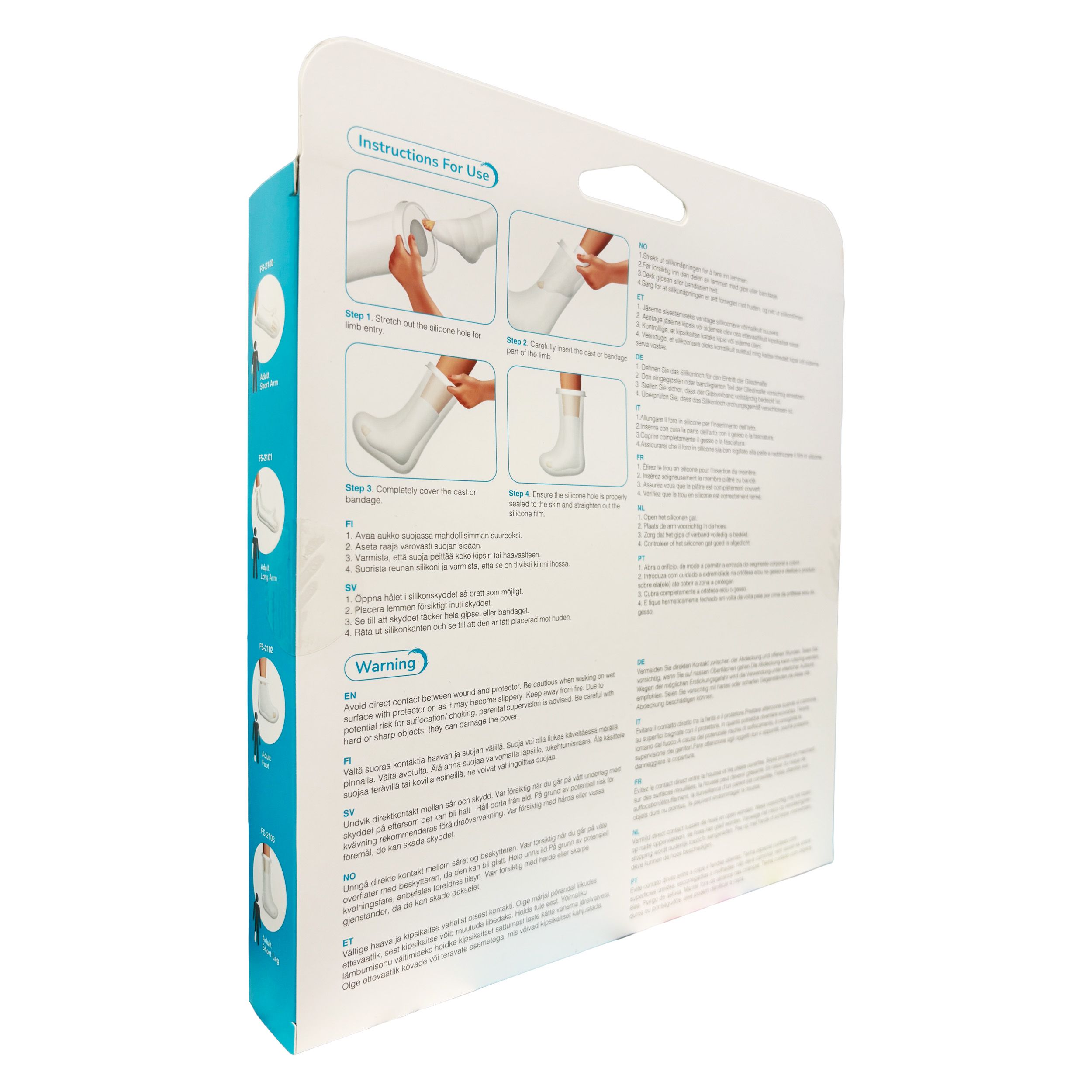 Käyttöohje: Avaa suojassa oleva aukko mahdollisimman suureksi. Aseta jalka varovasti suojan sisään. Varmista, että suoja peittää koko kipsin tai haavasiteen. Suorista reunan silikoni ja varmista, että se on tiiviisti kiinni ihossa.