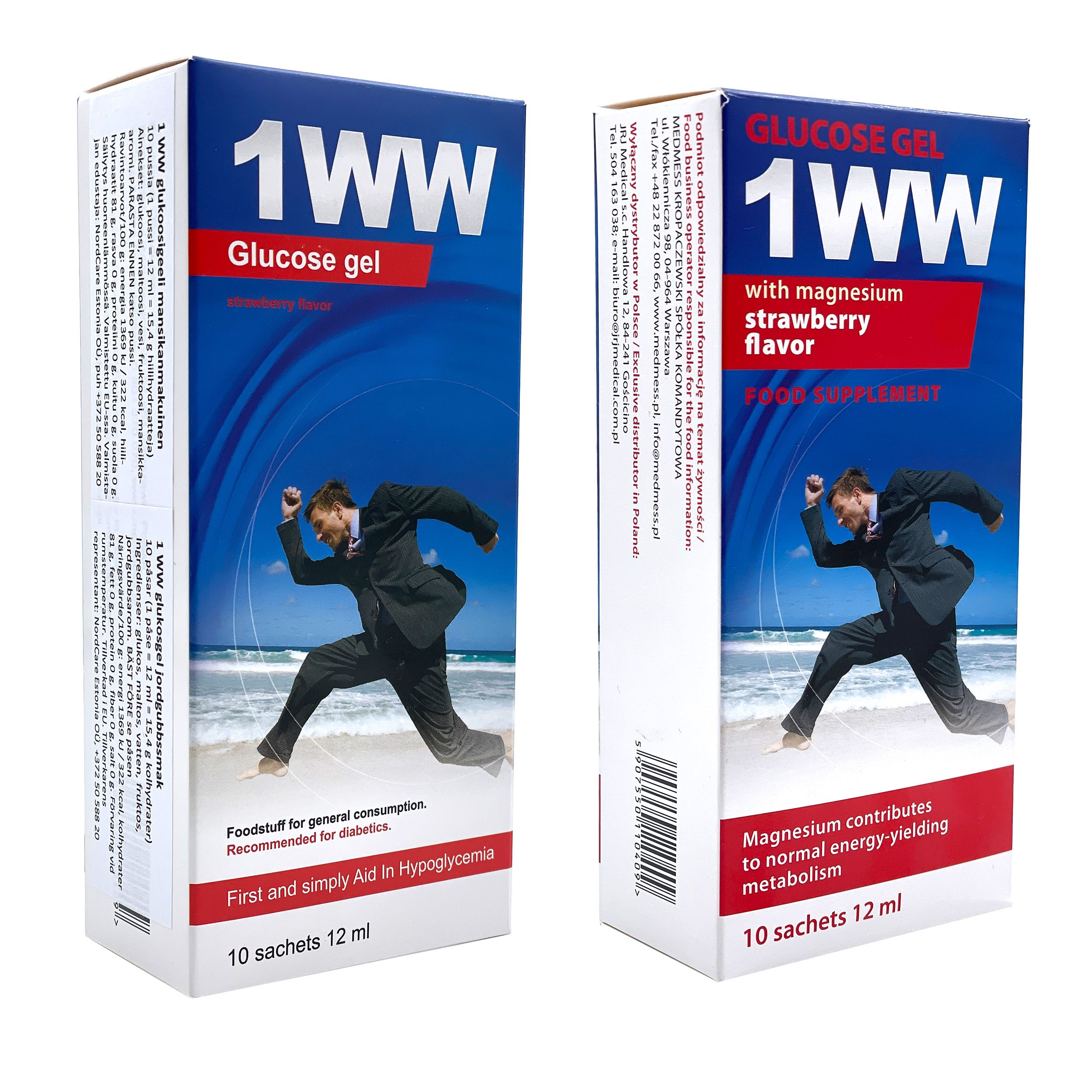 Glukoosigeeli 1WW hypoglykemian eli matalan verensokerin korjaamiseen. Yksi annos sisältää 15,4 g hiilihydraatteja. Glukoosigeeliä on saatavilla kahta perusmakua appelsiini ja mansikka ja lisäksi makuna mansikka, jossa on lisättynä magnesiumia. Glukoosigeeliä on helppo kantaa mukana. Pakkaus sisältää 10 annospussia (1 annos = 12 ml/19 g = 15,4 g hiilihydraatteja).
