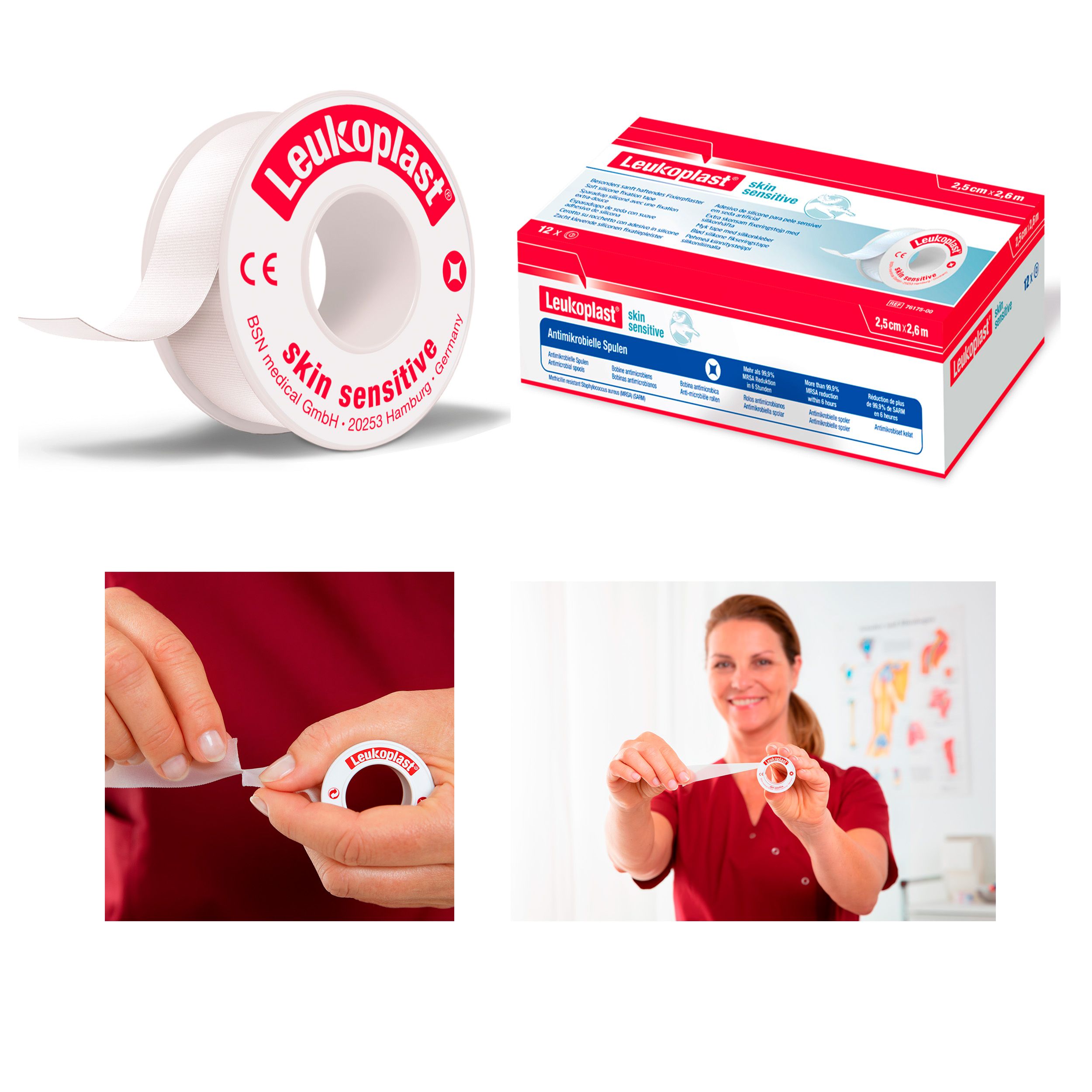 Leukoplast skin sensitive on hellävarainen teippi herkän ihon haavasidosten kiinnittämiseen. Se sopii myös letkujen, katetrien ja kanyylien lisäkiinnitykseen. Silikonipintaisessa kiinnitysteipissä on hengittävä koostumus ja se on läpinäkyvää sekä silkkipintaista.