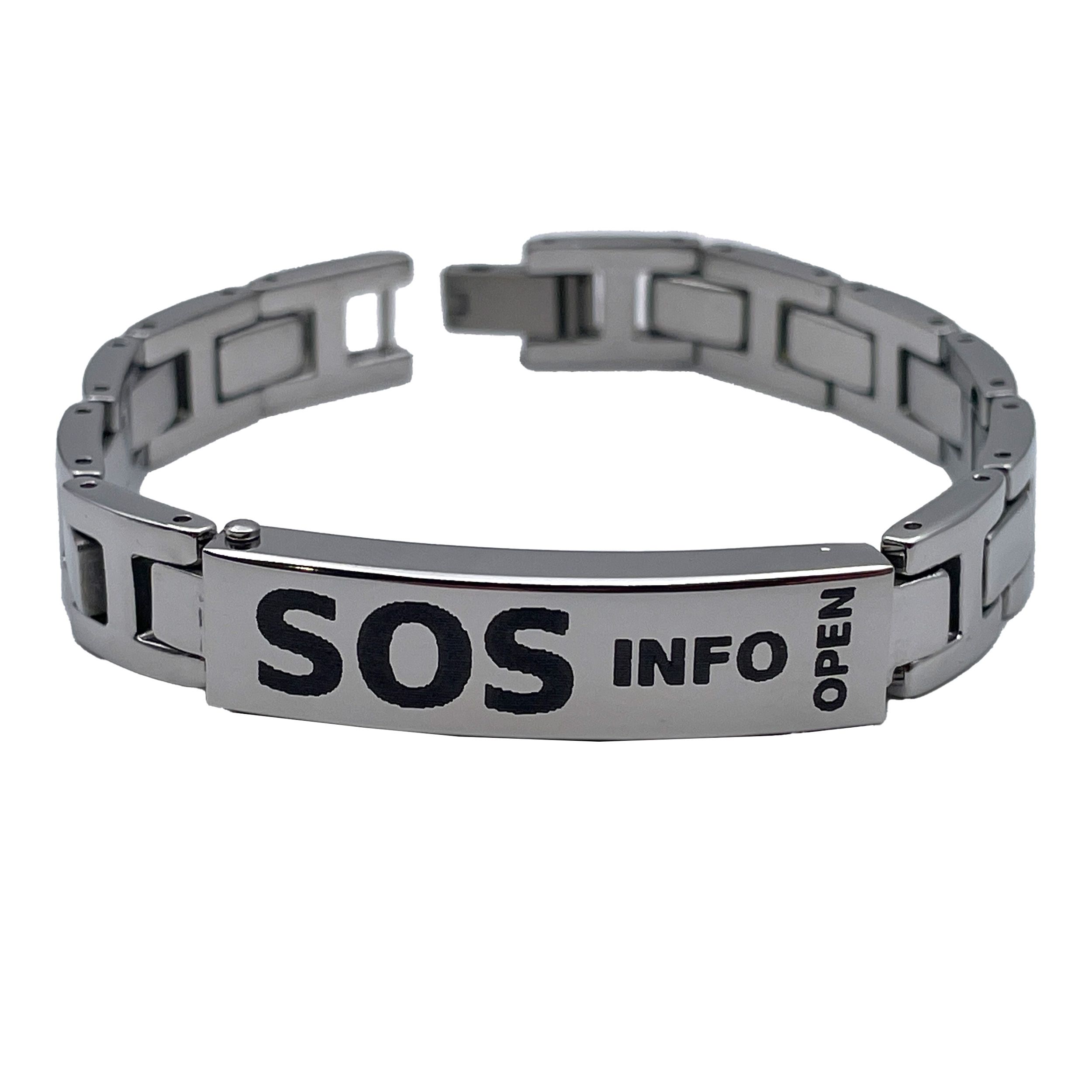 Onko sinulla sairaus, joka altistaa esimerkiksi sairauskohtaukselle tai tapaturmalle? SOS-ranneke tuo turvaa arkeen. Heimo-korun valmistama teräksinen ranneke on oikea valinta ajattoman tyylin ystävälle. Laatassa olevaan koteloon mahtuu minikokoinen lomake terveys- ja yhteystietoja varten. Laattaan on kaiverrettu teksti ""INFO"", joka opastaa avaamaan kotelon.