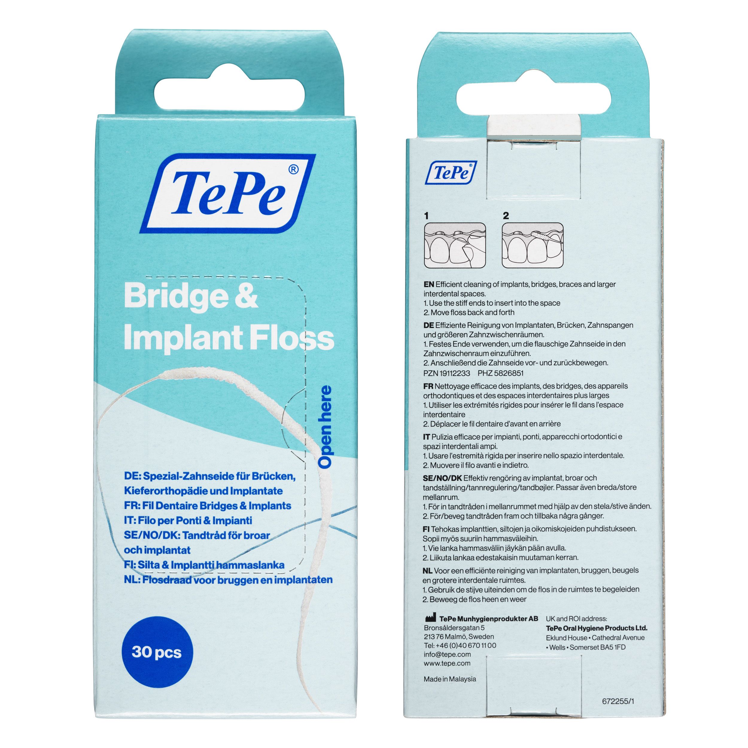 Paksu ja joustava TePe Bridge & Implant Floss ‑hammaslanka on suunniteltu implanttien, hammassiltojen ja oikomiskojeiden puhdistukseen. Se soveltuu myös parodontologiseen hoitoon.