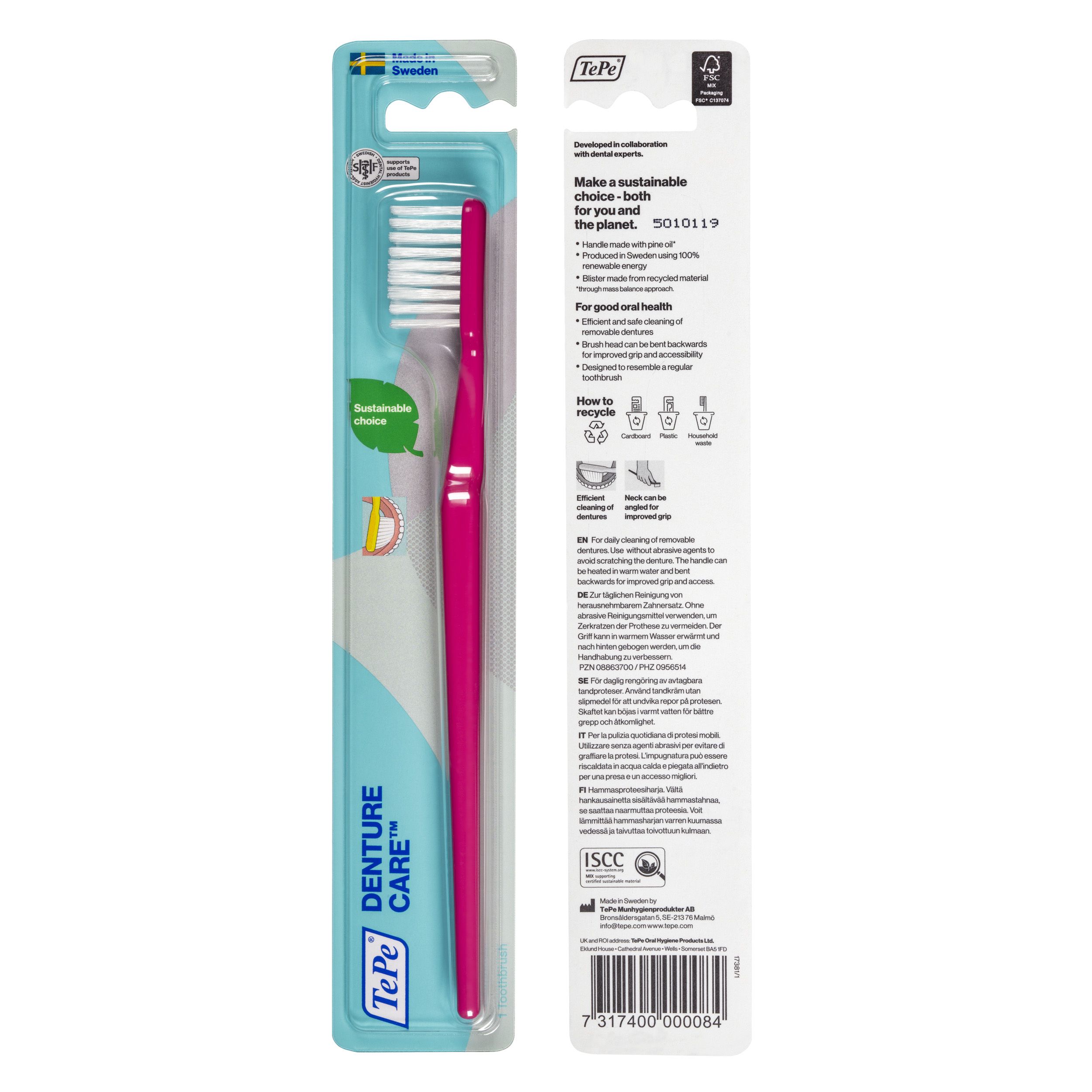 TePen hammasproteesiharjassa on erittäin pitkät ja vahvat harjakset, joten se on optimaalinen irrotettavan proteesin puhdistukseen.