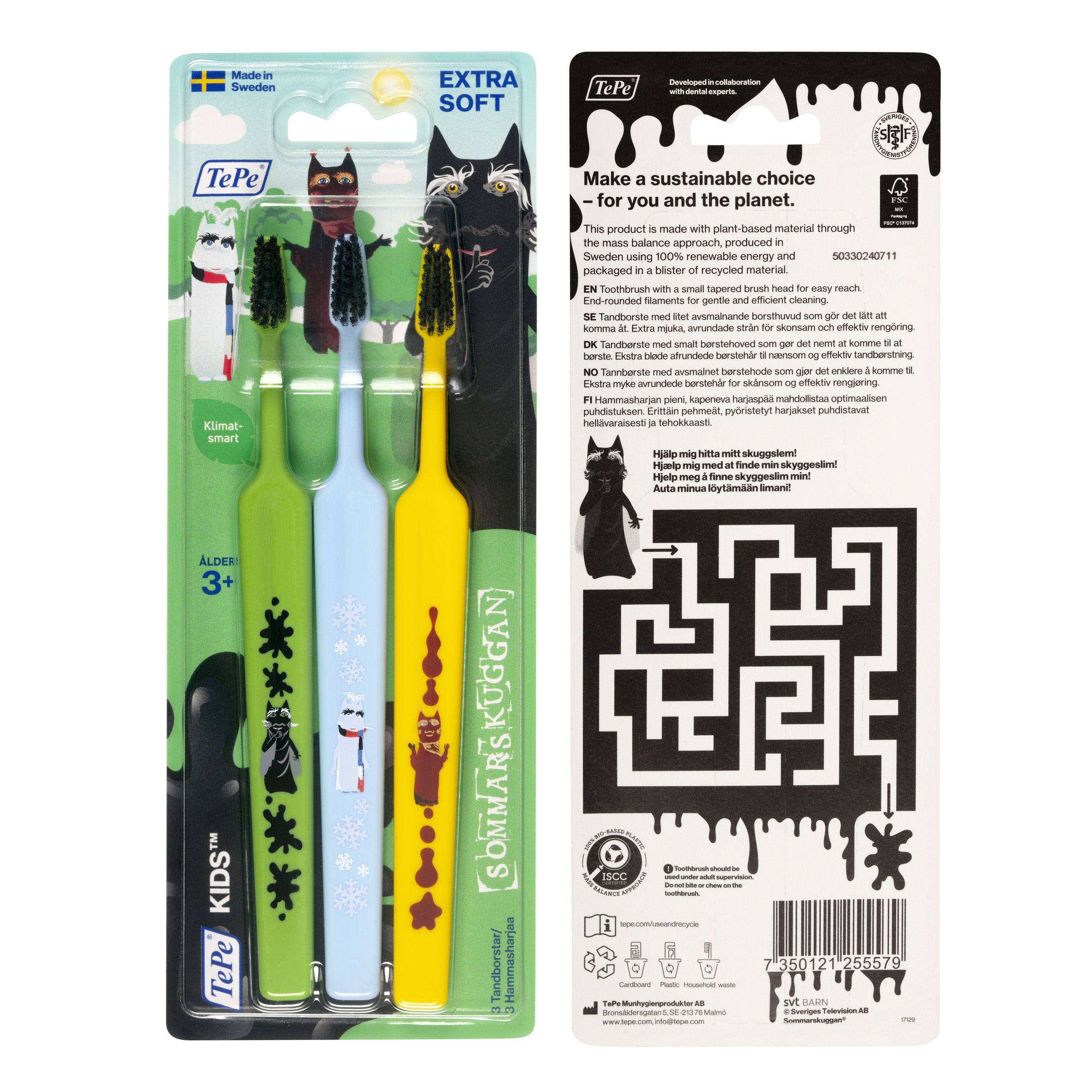 TePe Kids Sommarskuggan on osa kestävää TePe Select -valikoimaa. Harjassa on kapeneva harjaspää ja pienempi varsi. Leikkisä kuvitus houkuttelee hammaspesulle. Suositellaan yli 3-vuotiaille lapsille.