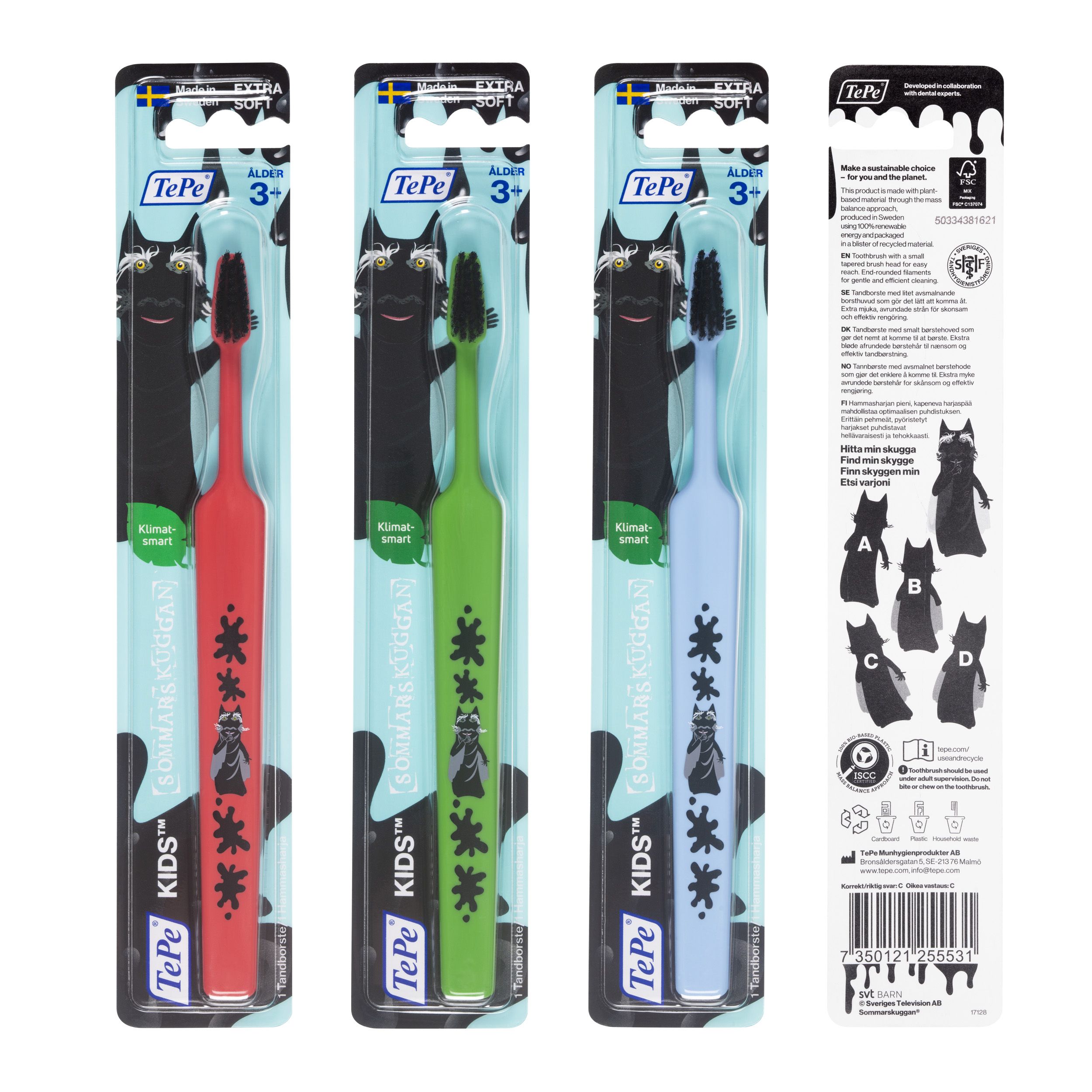 TePe Kids Sommarskuggan on osa kestävää TePe Select -valikoimaa. Harjassa on kapeneva harjaspää ja pienempi varsi. Leikkisä kuvitus houkuttelee hammaspesulle. Suositellaan yli 3-vuotiaille lapsille.