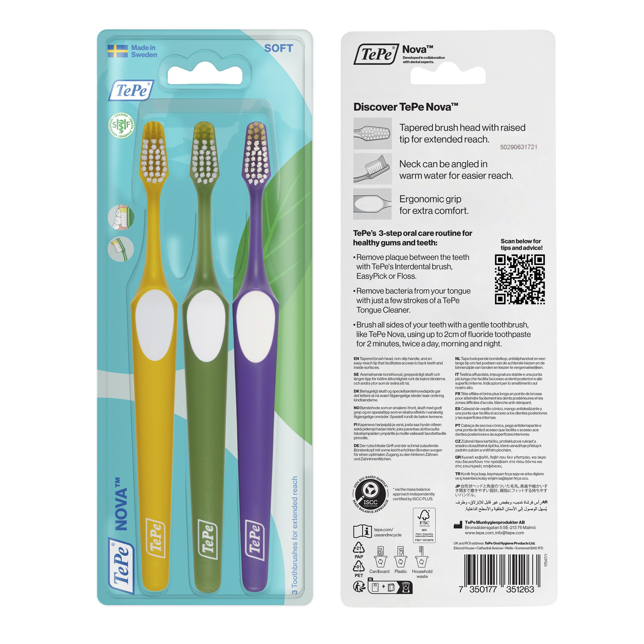 TePe Nova ‑hammasharjassa on kapeneva harjaspää ja hyvin ulottuva kärki, joka helpottaa vaikeapääsyisten alueiden puhdistusta. Pyöristetyt harjakset puhdistavat hellävaraisesti ja tehokkaasti.