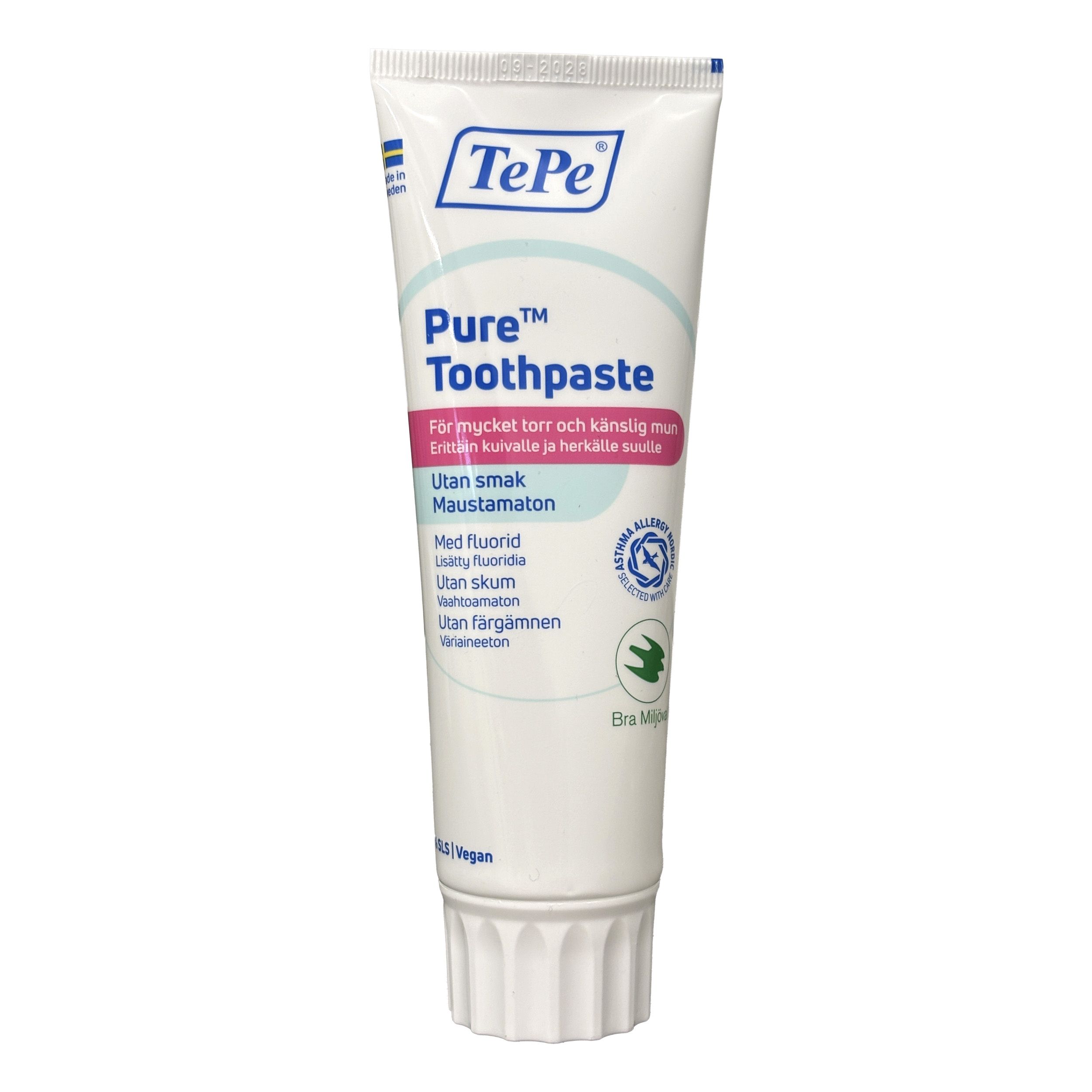 Tämä tahna sisältää fluoridia (1450 ppm), joka auttaa ehkäisemään hampaiden reikiintymistä. TePe Pure ei sisällä vaahdotusaine SLS:ää, joka voi ärsyttää herkkiä suun limakalvoja.
