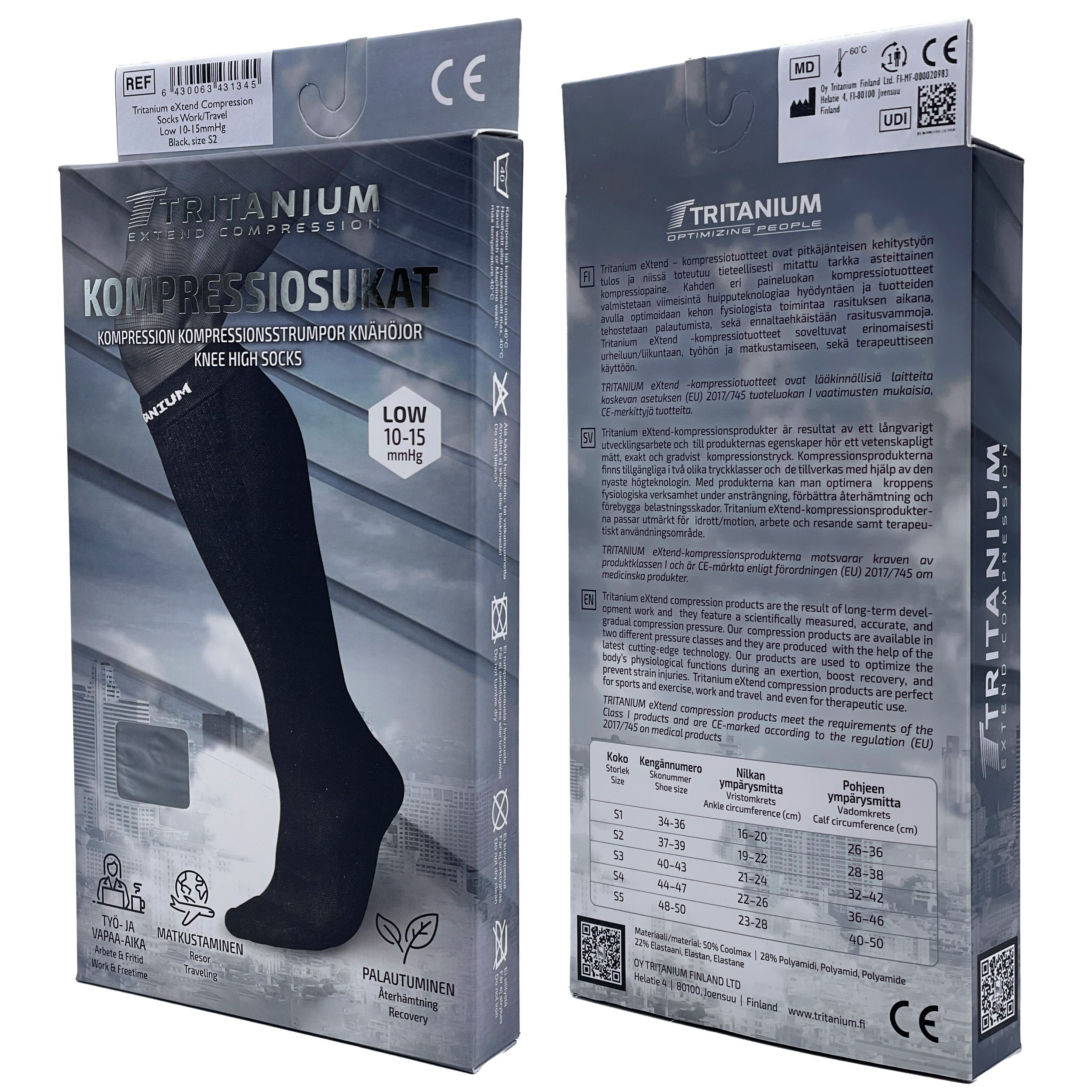 Tritaniumin eXtend Low -kompressiosukilla nopeutetaan palautumista, vähennetään treenin jälkeistä lihasarkuutta ja ehkäistään jalkojen väsymistä. Tähän kokonaisuuteen päästään optimoidulla asteittaisella matalalla kompressiopaineella (10-15mmHg), teknisillä ominaisuuksilla ja laadukkailla materiaaleilla.