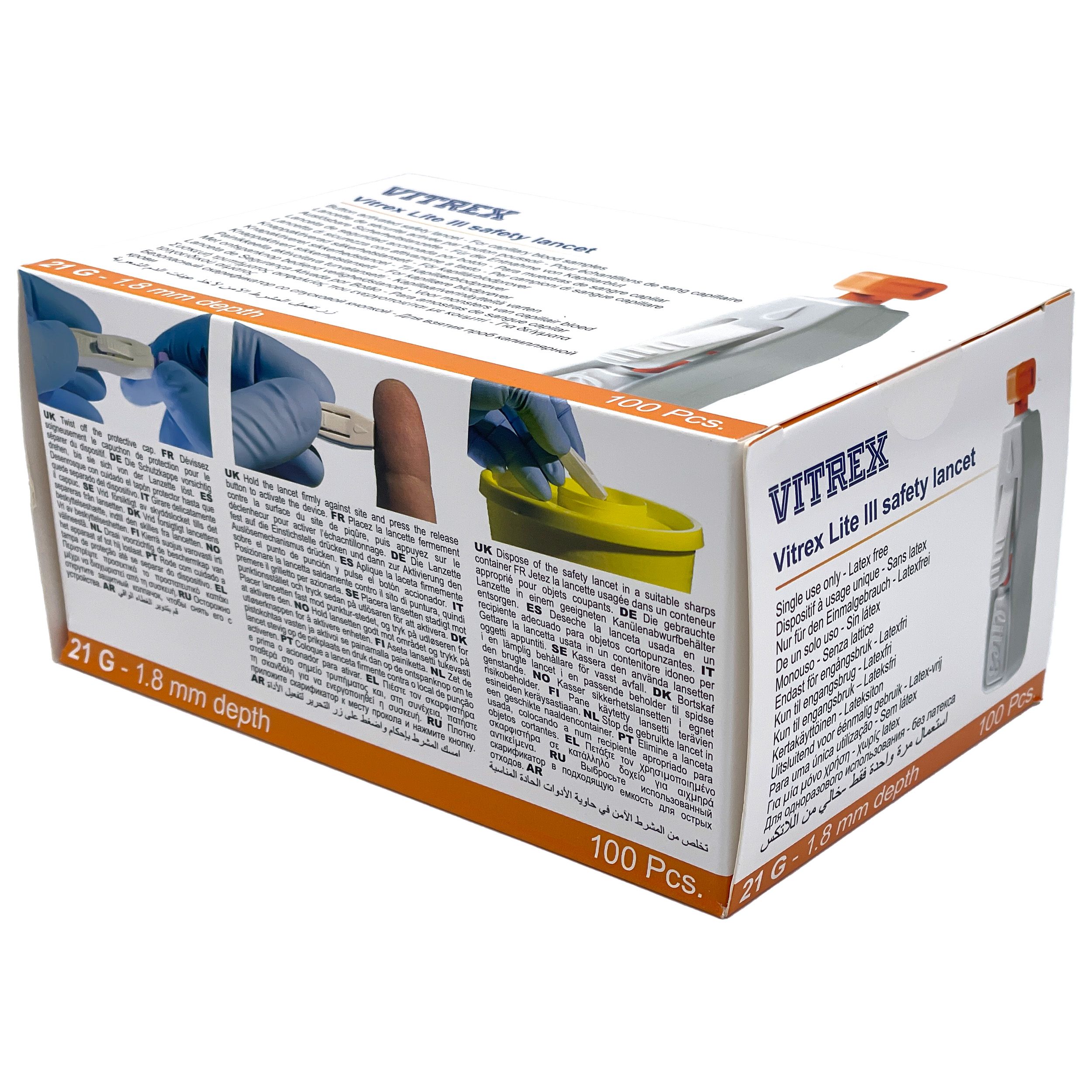 Vitrex Sterilance Lite III -turvalansetti soveltuu näytteenottoon verensokerin mittaamisessa ja muissa diagnostisissa testeissä. Turvalansetteja käytetään erityisesti terveydenhuollossa niiden turvallisuuden ja steriiliyden vuoksi. Turvalansetin kanssa ei tarvita erillistä pistolaitetta.